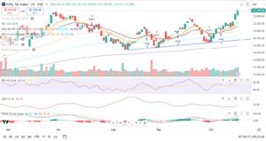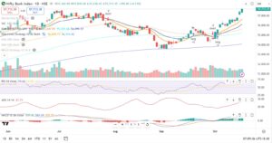 The weekly chart displays a sizable bull candle with strong closing near the week’s high, indicating sustained buying pressure and positioning the index for a potential assault on the all-time high of 26,277.35 achieved in September 2024.​