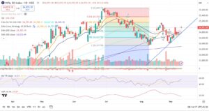 The index has formed a Doji or high wave-like candlestick pattern, indicating indecision between bulls and bears. However, the RSI has climbed to 56.81 with a positive crossover, while the MACD shows bullish momentum with the histogram gaining strength.